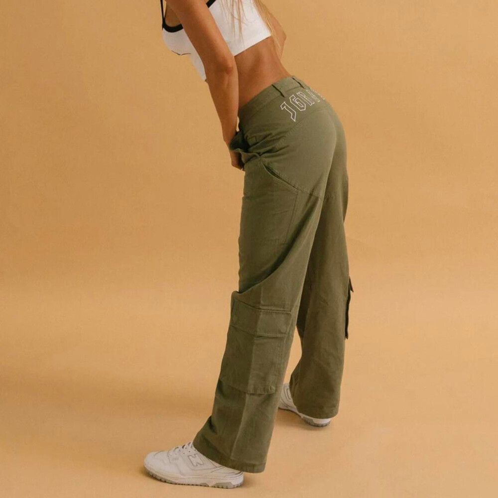 Mid-low rise fit with a wide leg, zip & button fastening, and multiple cargo pockets.