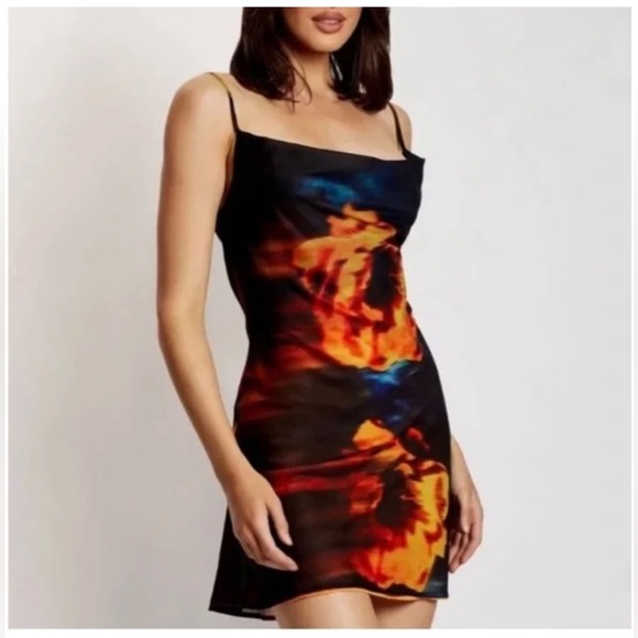 Meshki Cleo Printed Chiffon Cowl Neck Mini Dress in an abstract floral print, never worn and in perfect condition.
