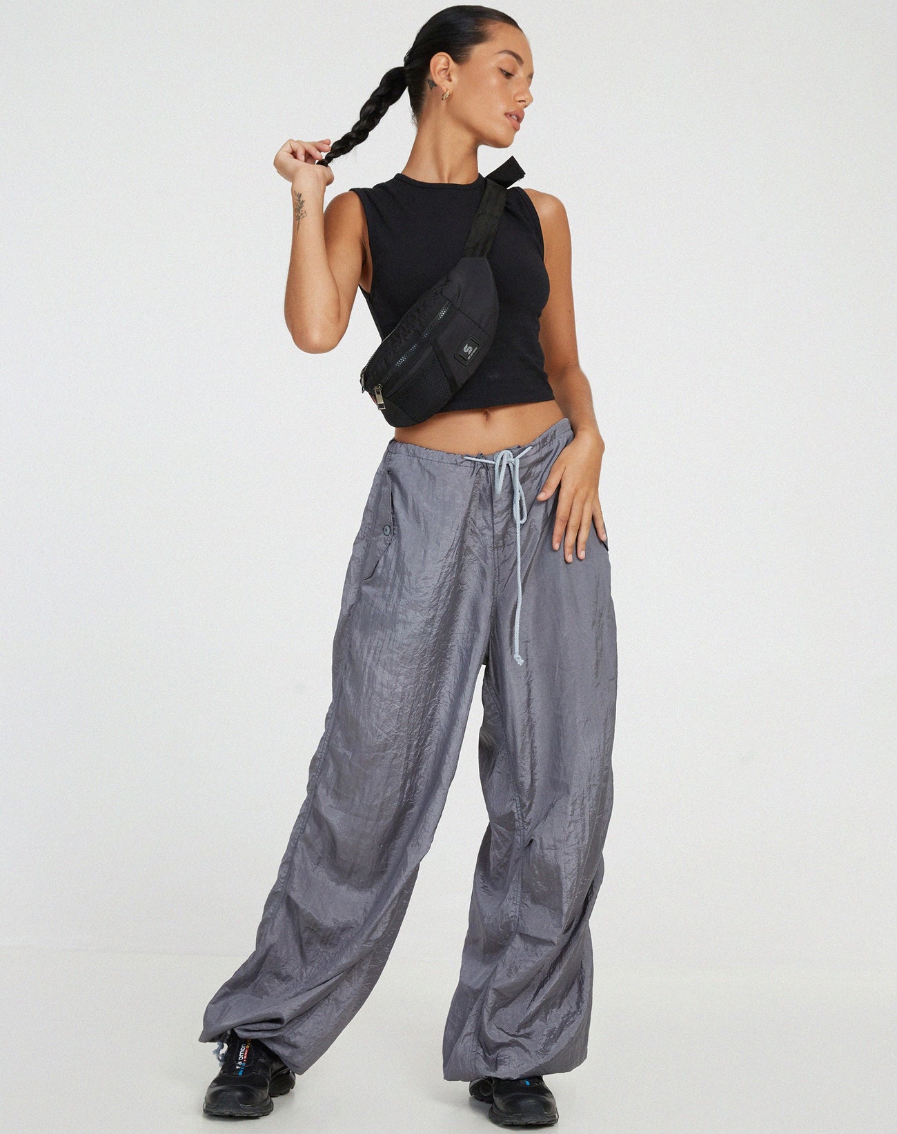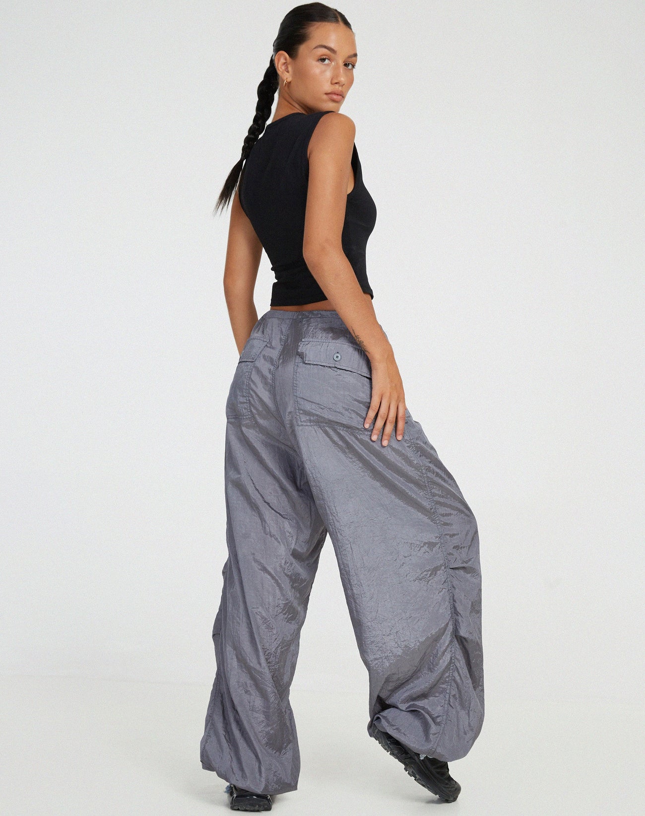 Low-rise parachute pants with a wide leg fit and tie-up detailing.